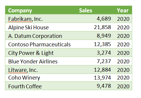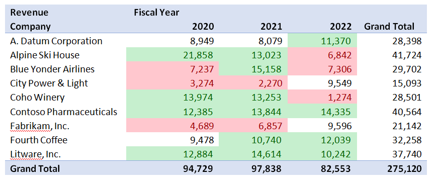 We’ve highlighted Revenue above 10,000 in green and less than 8,000 in red. Even though we have three times as much data as in our first table, we can now easily discern which companies and years are high and low performers.