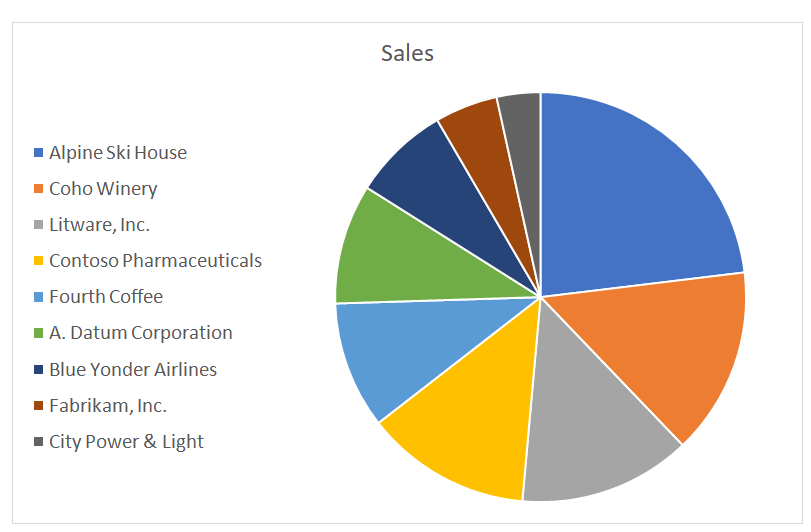 For instance, presenting the sales data seen in the paginated report above in a pie chart makes it much easier to see which customers contribute the most to sales.